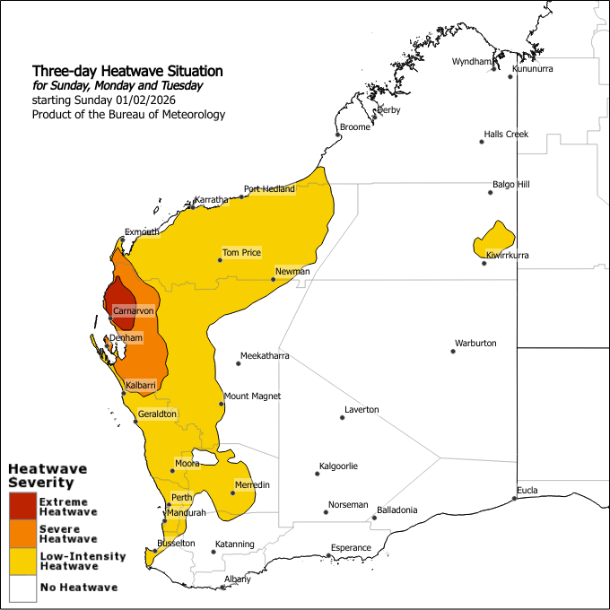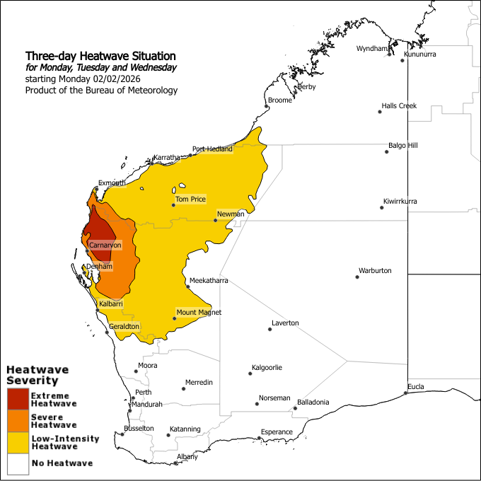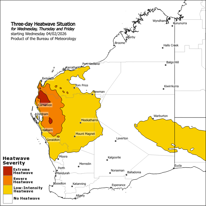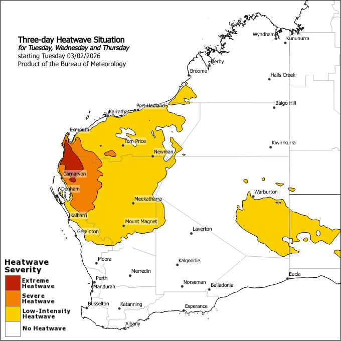 Maximum temperatures in the mid thirties to low forties along the coast and low to mid forties inland. Overnight minimum temperatures in the low twenties to high twenties. Severe to locally extreme heatwave conditions are expected to continue, potentially easing over the weekend. Locations likely to be impacted include Carnarvon, Coral Bay and Denham.